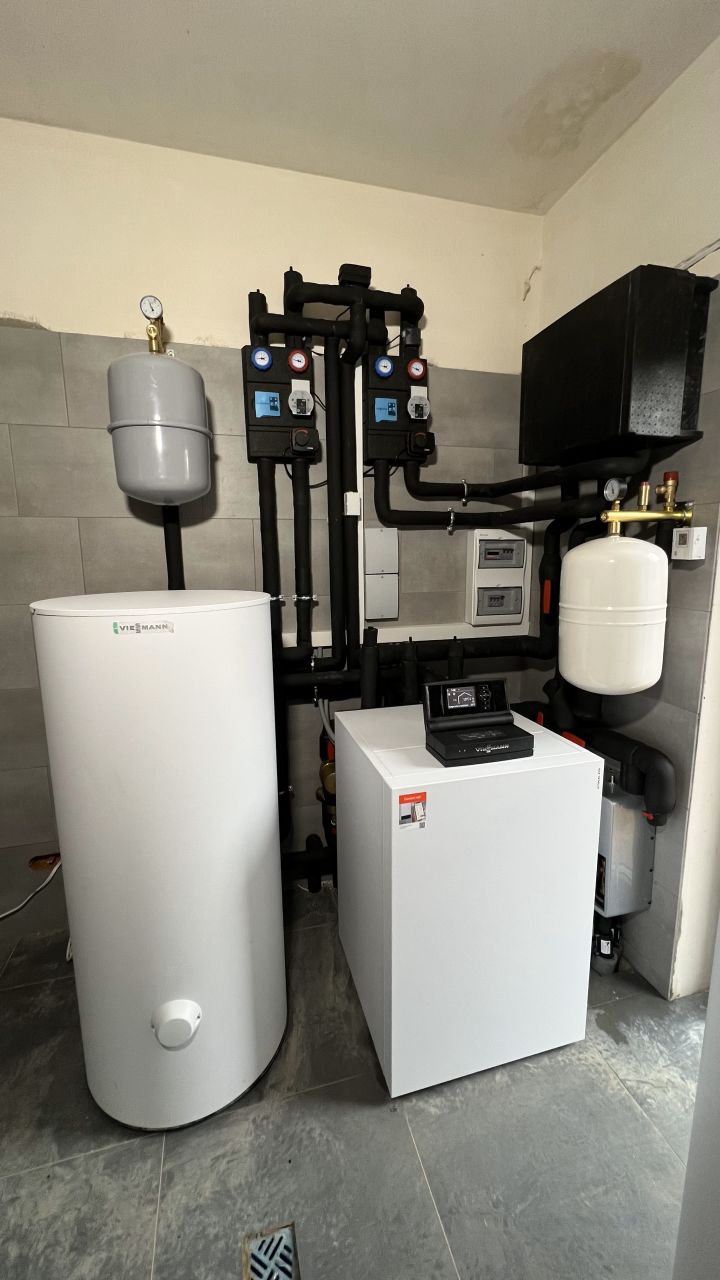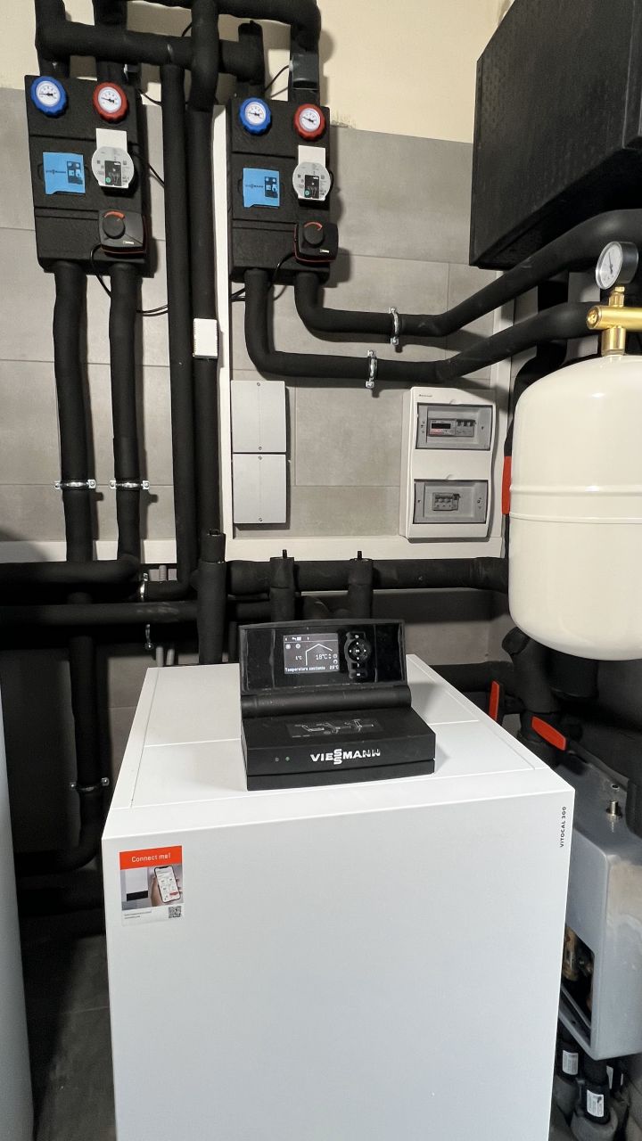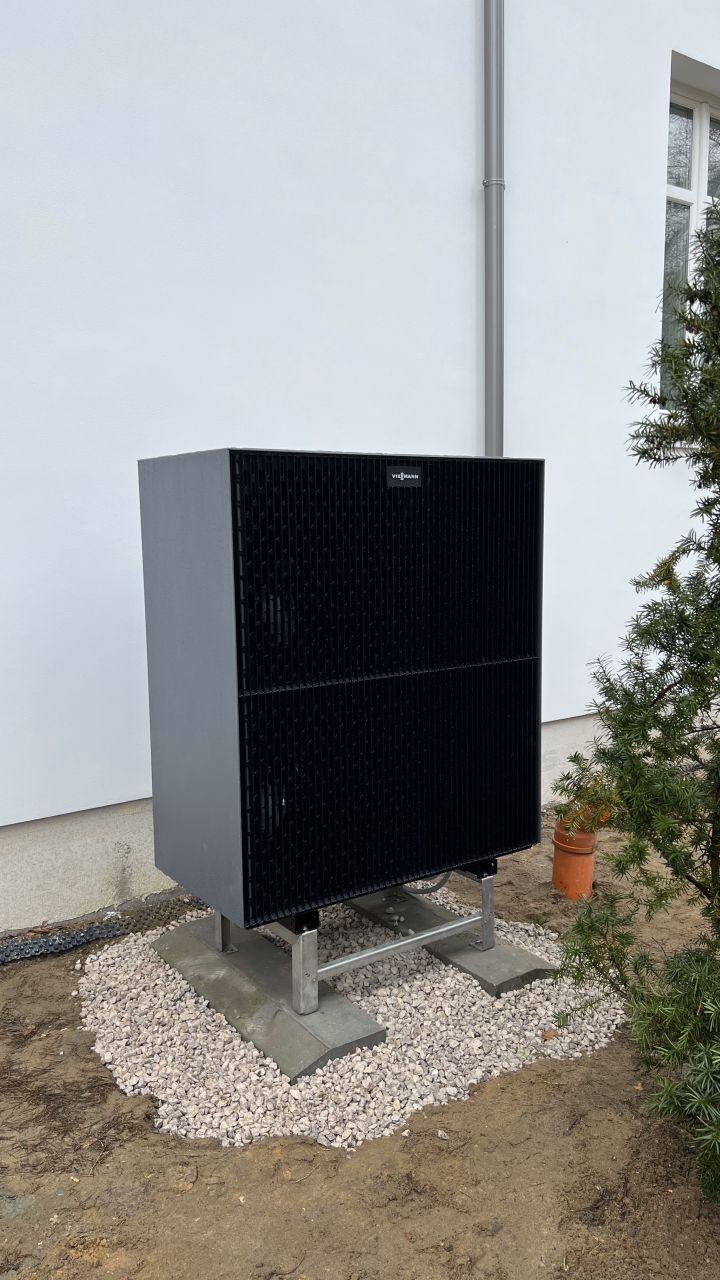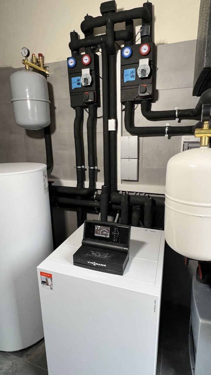 Nasz klient zdecydował się na najnowszą pompę ciepła firmy Viessmann, Vitocal 250-A o mocy 16kW czyli na monoblok. Drugim źródłem ciepła jest kondensacyjny kocioł gazowy Vitodens 100-W o mocy 25kW uruchamiający się jedynie przy bardzo niskich temperaturach zewnętrznych.