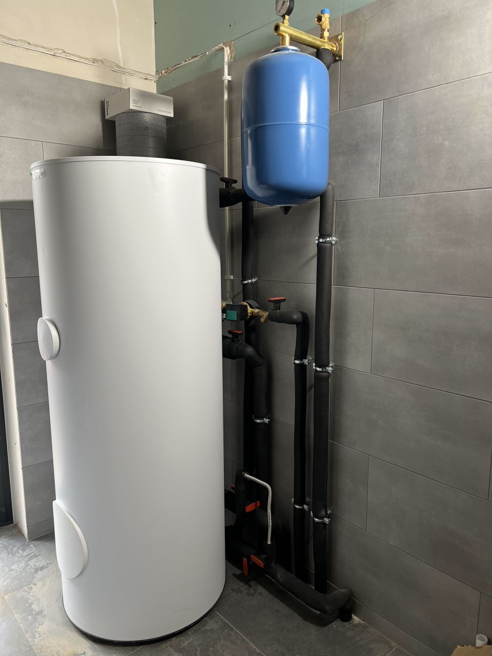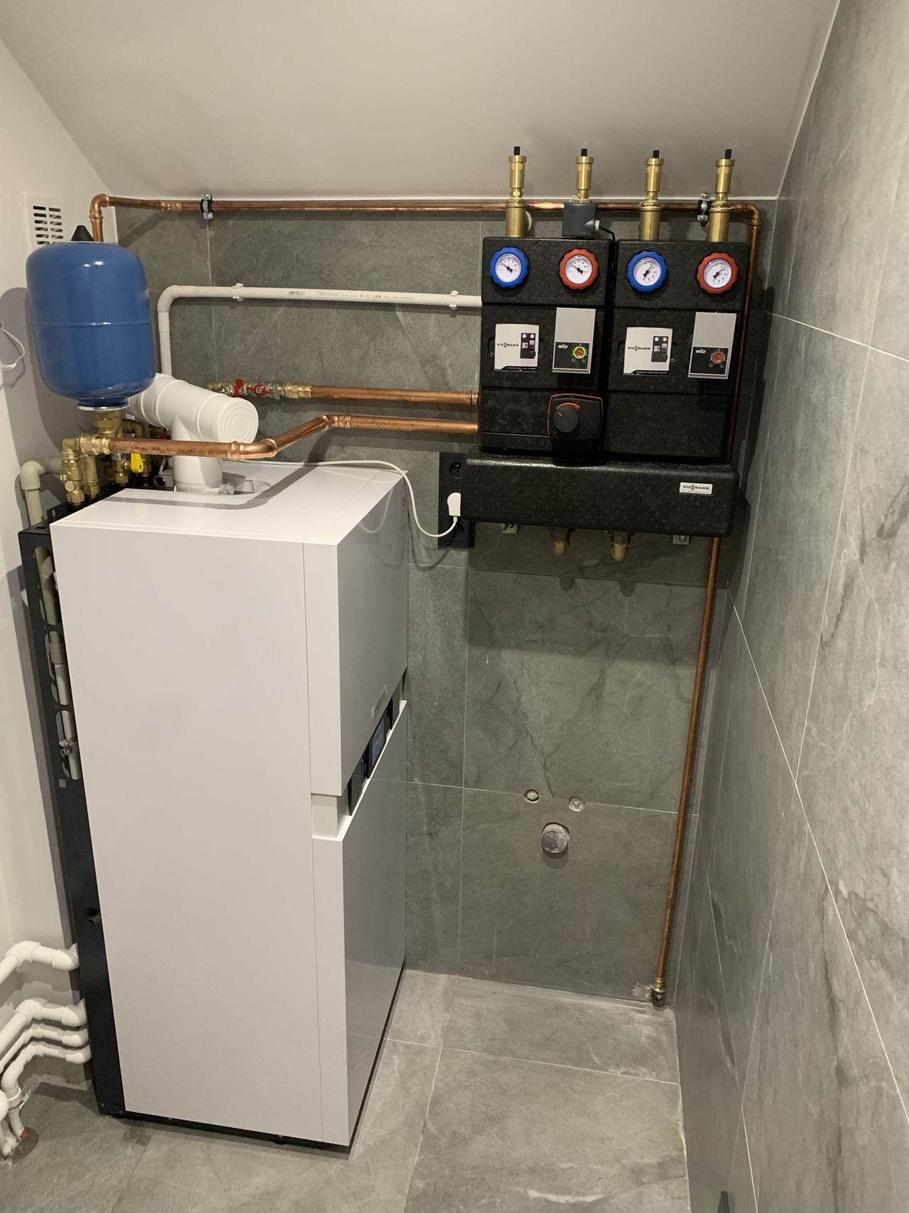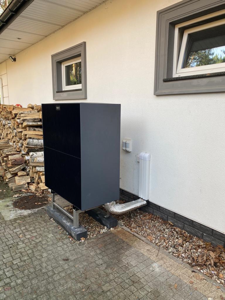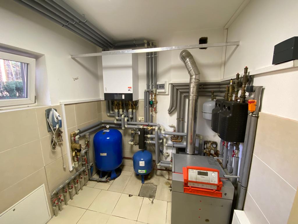 Nasz klient zdecydował się na najnowszą pompę ciepła firmy Viessmann, Vitocal 250-A o mocy 16kW czyli na monoblok. Drugim źródłem ciepła jest kondensacyjny kocioł gazowy Vitodens 100-W o mocy 25kW uruchamiający się jedynie przy bardzo niskich temperaturach zewnętrznych.