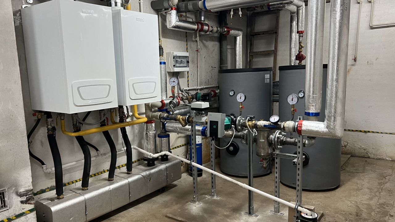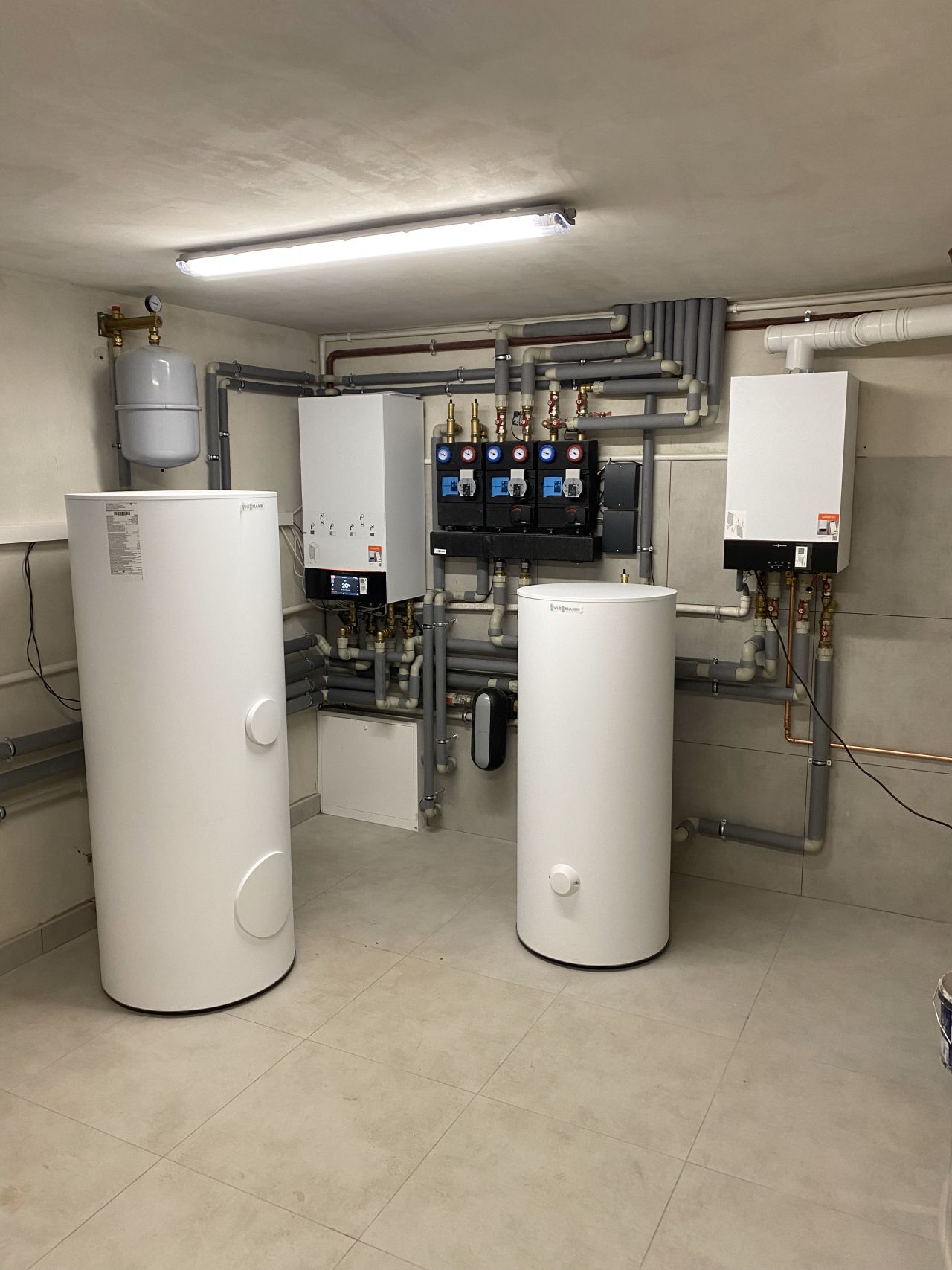 Realizacja w mieszkaniu szeregowym, kocioł gazowy Viessmann Vitodens 222-F o mocy 19kW. Deweloper wstępnie nie planował ogrzewania podłogowego jednak nasz klient zdecydował się żeby takowe było i zlecił nam jego wykonanie. Doposażyliśmy więc układ o sprzęgło hydrauliczne i drugi obieg grzewczy.